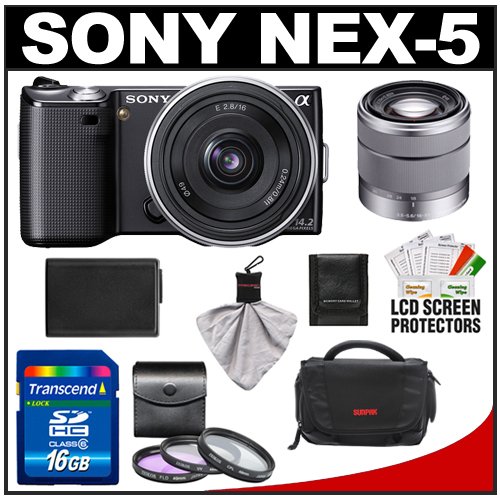 | Sony Alpha NEX-5 Digital Camera Body & E 16mm f/2.8 & 18-55mm f/3.5-5.6 OSS Zoom Lens (Black) with 16GB Card + Battery + Case + Accessory Kit |